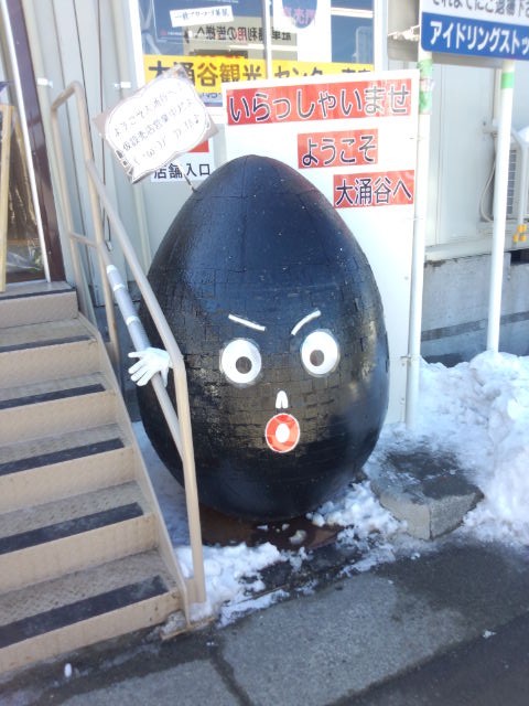 食べてから上の方まで行って、これから黒くなる白い卵が投入されるとこを見たり(笑)して、戻ってたまごソフトクリームと黒いソフトクリームだけど苺味!っての食べました。ふたつは食べてないよ?私が食べたのはたまごソフトの方で、味はなんていうかカスタードになる一歩手前?な?感じ?美味しかったですよ!